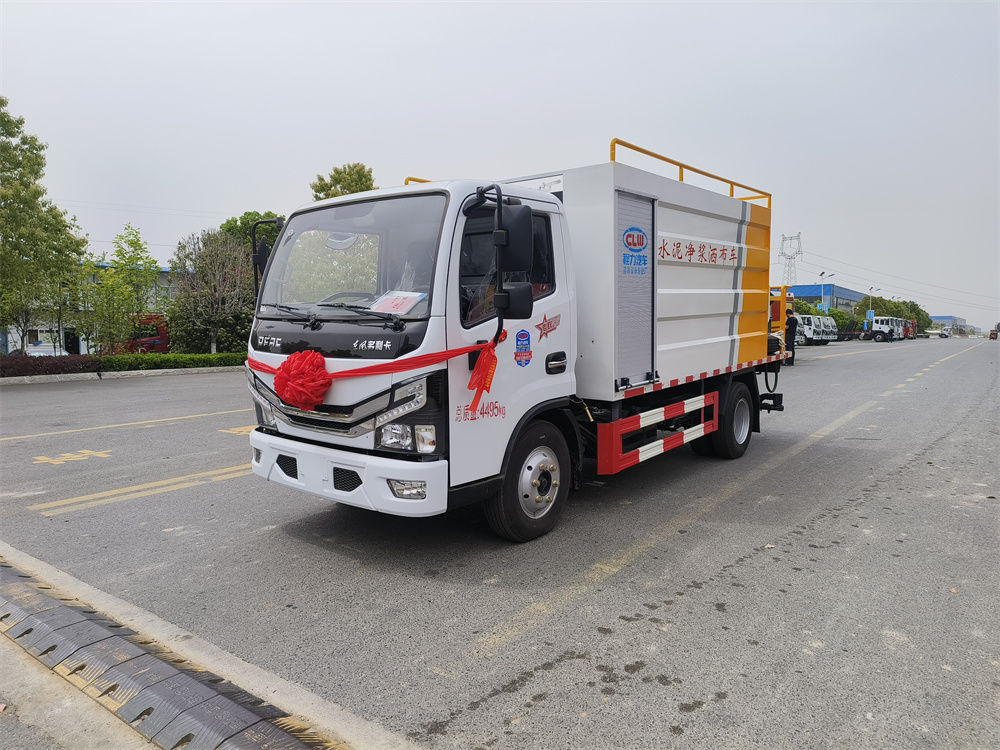 水泥罐、清水罐采用 Q235 優質碳鋼制作,高壓水泵,水泥泵(專用),攪拌系統,液壓系統,15 米高壓清洗管道(帶卷盤、手持清洗槍),減速分動箱(車輛在行駛工作過程中將車速減慢從而達到更加理想的灑布效果),尾部 13 個水泥漿專用噴頭,最大灑布寬度 4 米。其它配置常規。可選裝提升裝置(用于袋裝水泥向罐體頂部運輸)
